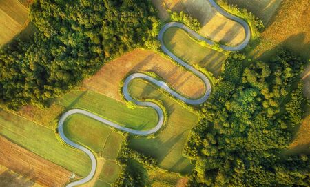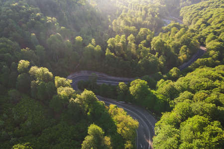 Aerial view of winding road in green forest. Top view of winding road in forest.
