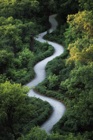 This aerial shot captures a winding road meandering through a lush green forest, evoking feelings of adventure and tranquility in nature.
