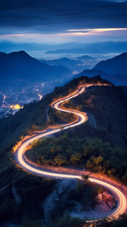 A long exposure shot captures the beauty of vehicles navigating the winding roads of the scenic byway creating an enchanting light trail display