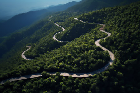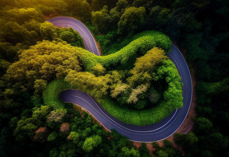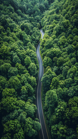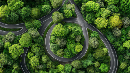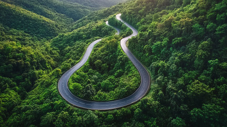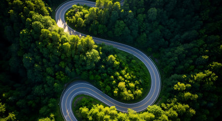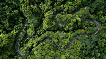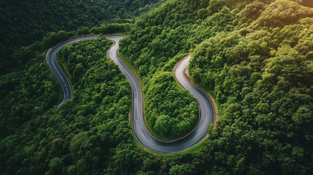 Aerial view of a winding road nestled in a lush green forest, showcasing the beauty of nature. Perfect for themes of travel, adventure, and serenity.