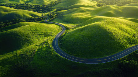 Overhead view of a serpentine road meandering through rolling green hills, captured from a drone perspective.