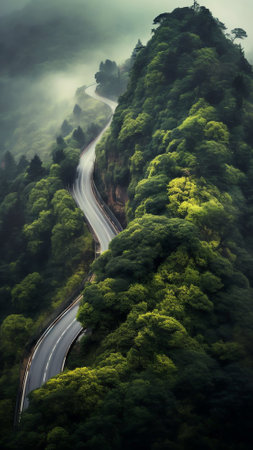 A breathtaking view of a winding road through lush green mountains, enveloped in mist, perfect for travel and nature photography enthusiasts seeking adventure.