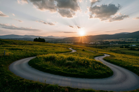 A winding asphalt road curves through vibrant green rolling hills and meadows, bathed in the warm golden light of a sunset sky.