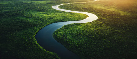 An aerial photograph showcases a river meandering through a dense forest. The scene is dominated by vibrant green trees and the winding river reflects the sky. The composition emphasizes natural beauty, with sunlight illuminating the landscape. Suitable for commercial applications such as environmental themes.