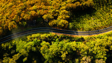 Drone view - Aerial view of autumn forest road. Top view of beautiful asphalt roadway