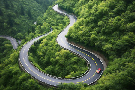 A winding road snakes through a vibrant green forest, captured from a stunning aerial perspective.