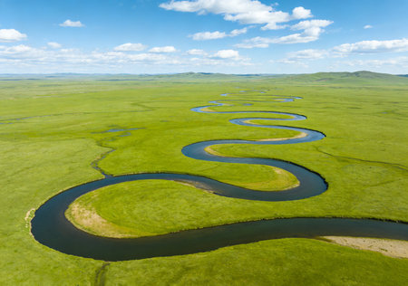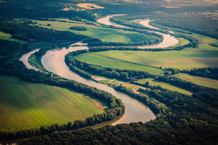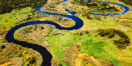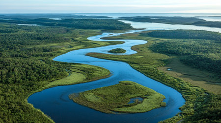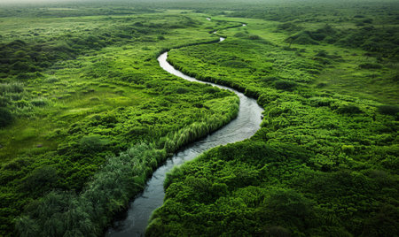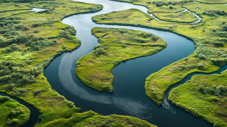 Serpentine River Meandering Through Lush Wetlands, Aerial Perspective of Nature s Waterways