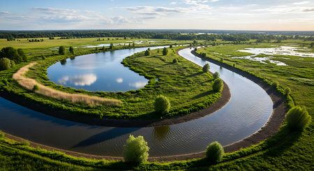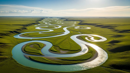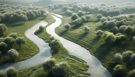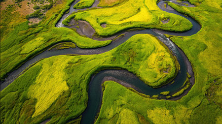 A mesmerizing aerial view showcasing winding river bends traversing a lush green landscape. the image highlights the beauty of the meandering waterways, emphasizing the vibrant greenery and calm, reflective waters perfect for nature and travel imagery. Generative AI