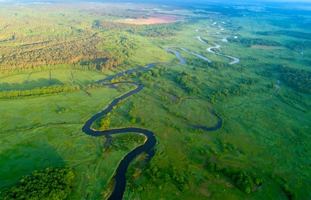 Summer aerial landscape. River in green meadow from above. Sunny summer morning.