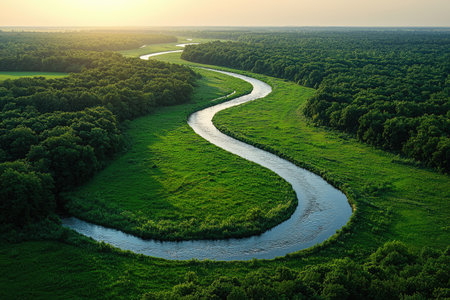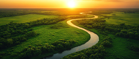 An aerial perspective captures a winding river snaking its way through a dense forest bathed in the warm, golden light of either sunrise or sunset. The sunlight filters through the lush green canopy, creating a dappled effect and illuminating the trees with a vibrant glow. The river's surface reflects the warm light and the surrounding foliage, adding to the serene and tranquil atmosphere of the scene. The vast expanse of the forest and the gentle curve of the river create a picturesque and...