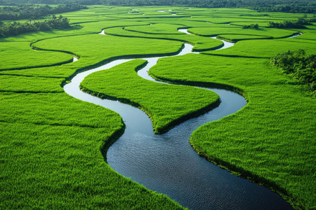 This captivating aerial scene captures a winding river flowing through verdant marshland, showcasing the beauty of nature in full bloom with vibrant greenery.