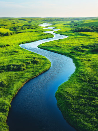 Picturesque river meanders through a vibrant green valley, carving its way between rolling hills covered in lush vegetation, creating a serene and captivating natural landscape