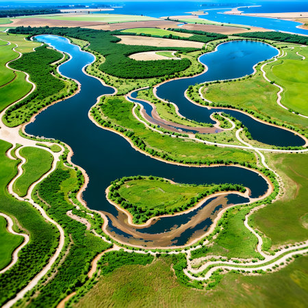 Stunning aerial photograph showcasing the captivating beauty of a serene river delta with its intricate network of winding waterways meandering through a lush