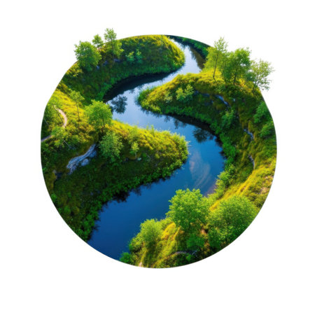 A vibrant aerial perspective of a miniature Earth sphere, showcasing a winding river cutting through dense, lush green forests. A breathtaking vision of nature's beauty and interconnectedness.