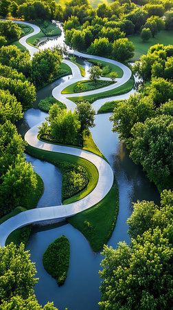 An eye-level aerial perspective captures a smoothly curving walkway meandering through a vibrant green park setting. The path intersects a tranquil waterway, creating a serene natural retreat.