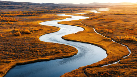 A breathtaking view of a winding river flowing through a vibrant autumn landscape at sunset. The warm hues and tranquil water evoke a sense of peace and natural beauty.