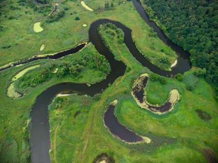 Aerial view of winding river and forest. Summer landscape, top view. A green valley with a winding riverbed