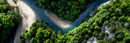 Overhead shot of a winding river cutting through a dense, vibrant green forest, highlighting natures intricate patterns. aerial view. Resplendent.