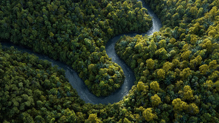 An impressive aerial perspective reveals a winding river snaking its way through a vast, dense forest. The river's dark blue water creates a striking contrast against the vibrant green canopy of the trees. The serpentine path of the river forms an intricate, organic pattern, showcasing the natural beauty and untouched wilderness of the area. The dense foliage of the forest stretches as far as the eye can creating a rich texture and a sense of deep immersion in nature.