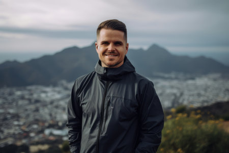 Handsome young man in black jacket standing on top of mountain and looking at camera