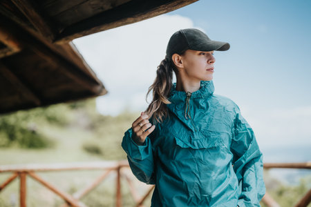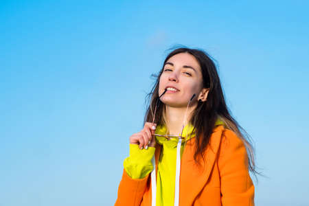 Young woman stands on the beach in jacket and puts the hood on the head. Girl is getting ready for a morning jog.