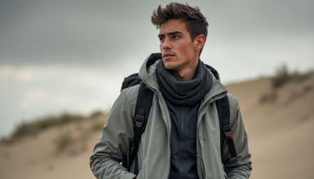 A handsome young man, dressed in modern outdoor attire, gazes thoughtfully into the distance amidst a stunning desert landscape. His rugged look, complete with a scarf and backpack, captures the spirit of adventure and exploration, inviting viewers to embrace the great outdoors.