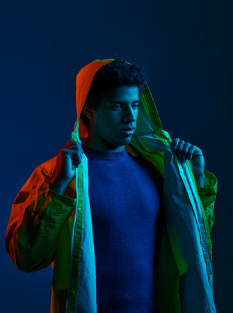 Close up of young hipster man in brown winter jacket, hood on head, in the streets of London