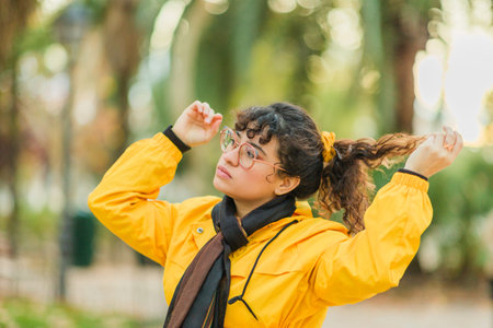Portrait of a young beautiful girl with curly hair in a yellow jacket