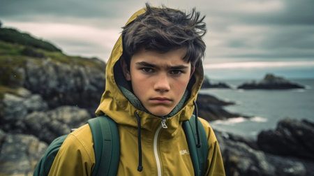 Close Up of Serious Teenager Boy Looking at Sea and Rocks generated by AI