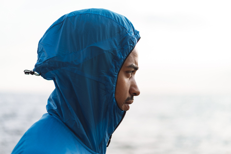 Photo of a strong handsome young african sports man outdoors at the beach sea.