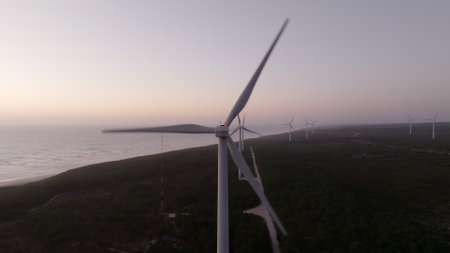 Close-up view of a wind turbine with its large blades turning, located near a coastal forest and ocean during sunset