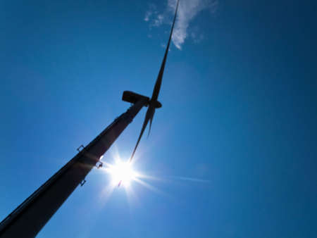 Low-angle view of a windmill with sun and blue sky in the background. Horizontal.