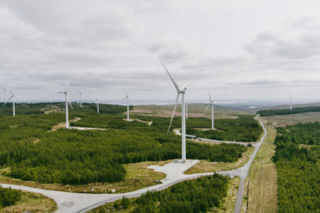 Connemara aerial landscape with wind turbines of Galway Wind Park located in Cloosh Valley, County Galway. Largest onshore wind farm in Ireland, green energy generation. Galway Wind Way recreation.