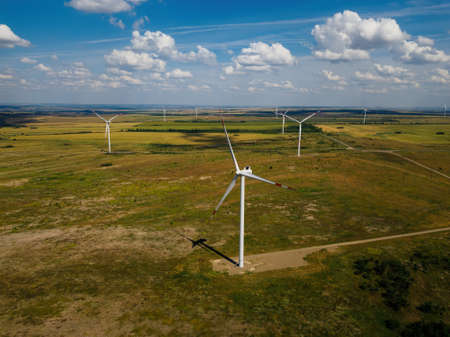 Wind turbines at the countryside in summer day, aerial view.