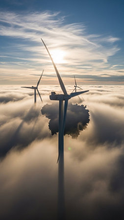 Aerial view of wind turbines or windmills farm field in industry factory with sea fog. Power, sustainable green clean energy, and environment concept. Nature innovation.