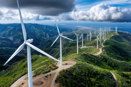 Wind turbines on beautiful sunny mountain landsape. Green power generation concept.