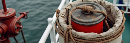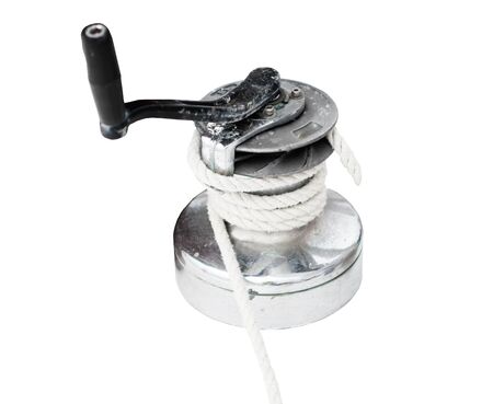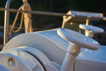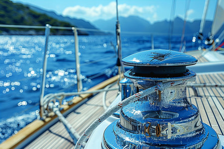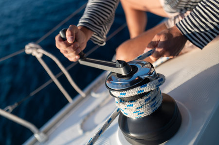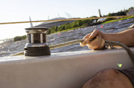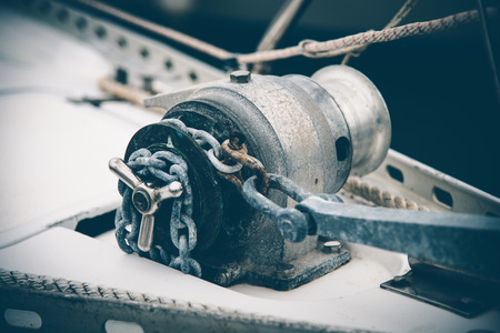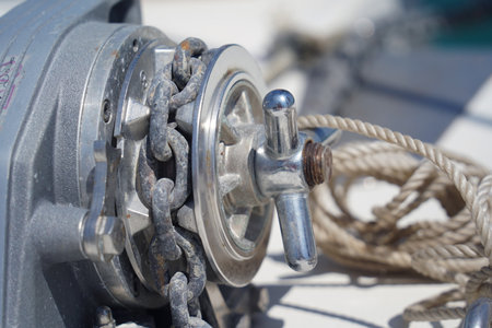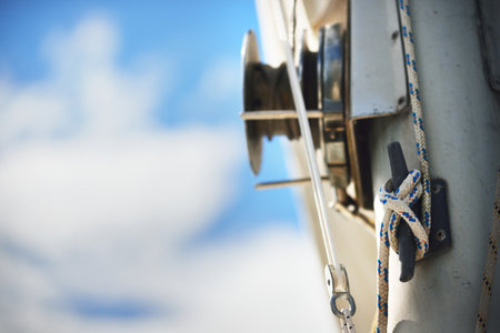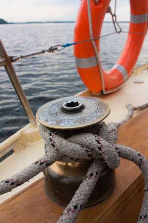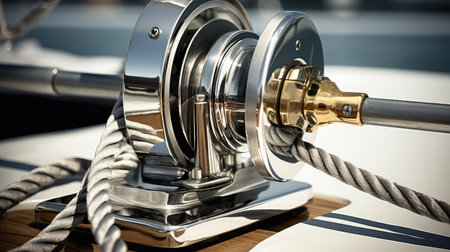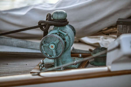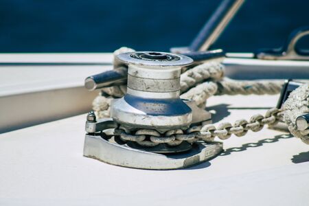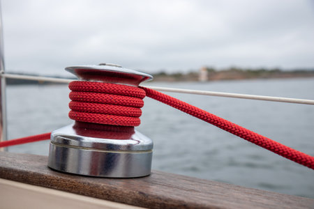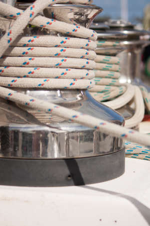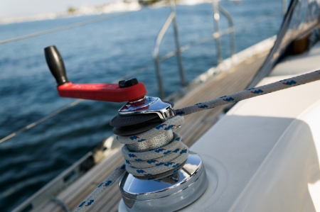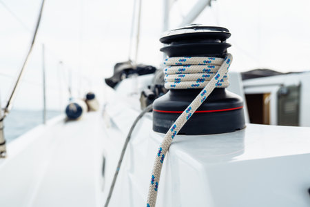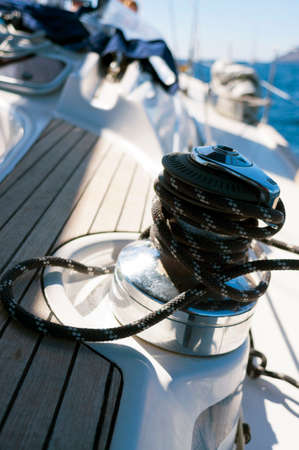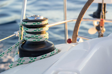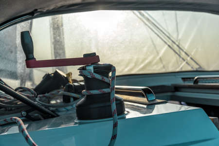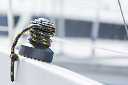 Yacht capstan with rope on sailing boat during cruise, marine objects concept.