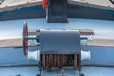 Windlass. Rusty metal chain. The mechanism for raising the anchor. Winch. Equipment on a yacht. Sea swimming. Close-up.