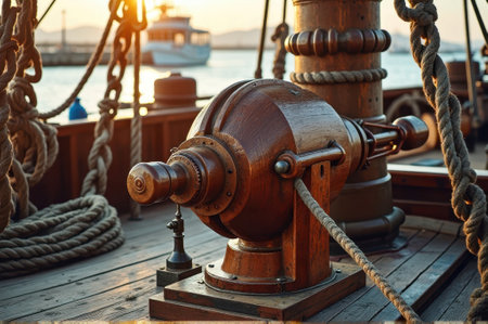 Antique cap woodenstan on sailboat deck at sunset near harbor.