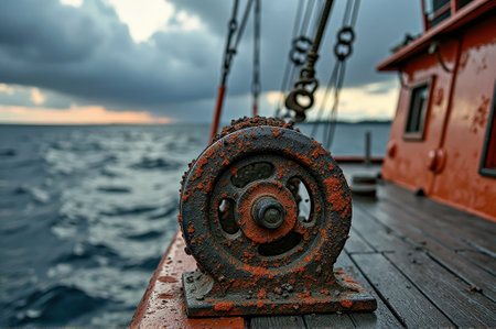 Rusty anchor windlass on old sailboat deck at sea with dramatic sky. That the image is generated using AI.