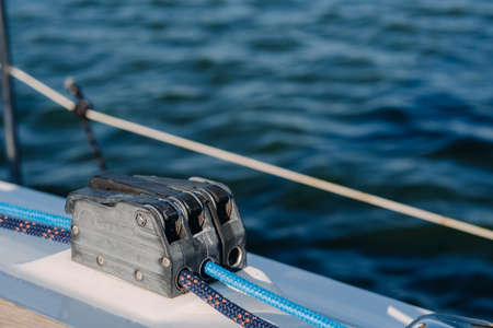 Sailboat detailed parts, close up on winch and rope of yacht over blue sea, shallow depth of field