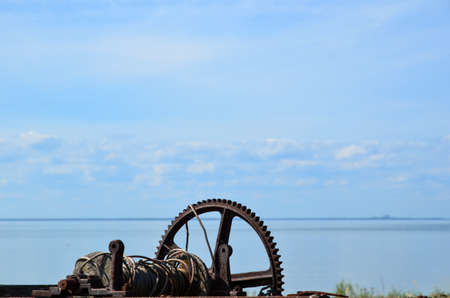 Rustic anchor machine and stored abandoned pipes on a dredging ship close up