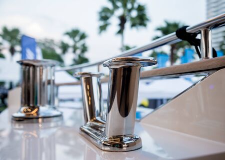 Metal bollard for boats and vessels on wharf over sea and sunset background close up. Maritime quayside with equipment for yatching at coastline. Travel season.