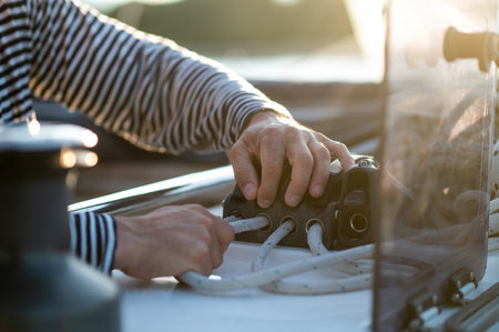 Sailboat winch on a sailing boat and ropes at stoppers, line jammer. Yachting details of rigging on a sailboat.