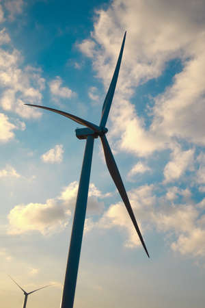 Wind turbine generating electricity clean energy with cloud and sunlight background on the sky. Clean energy concept. High quality photo