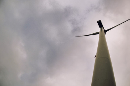 Horizontal axis wind turbine with grey sky and clouds. Wind energy in eco wind farm. Green energy concept. Renewal energy. Alternative electricity source. Sustainable resources.