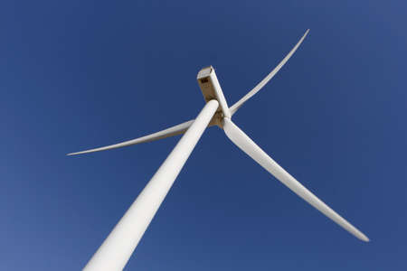 Modern wind turbine against blue sky, low angle view. alternative energy sources