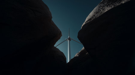Low angle view of a wind turbine between rocks. Alternative eco-friendly types of renewable electric energy.