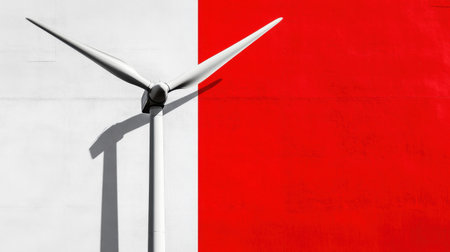 A modern wind turbine stands prominently against a striking red and white wall, symbolizing the shift towards renewable energy and sustainability.