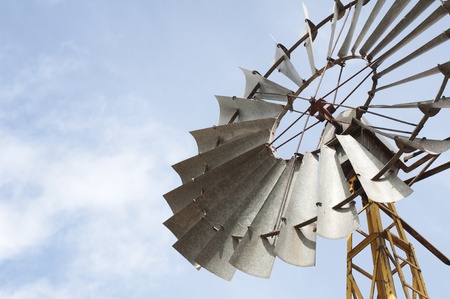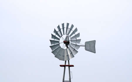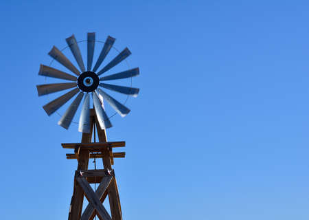 A close-up of an old-fashioned windmill on the prairies of Kansas. No people, copy space.